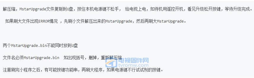 - 固件是否匹配:请务必核对您的电视型号(LE48G520N))物料号(DH1WE0D3301)与固件要求完全一致。刷入不匹配的固件可能导致电视变砖。